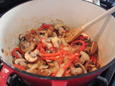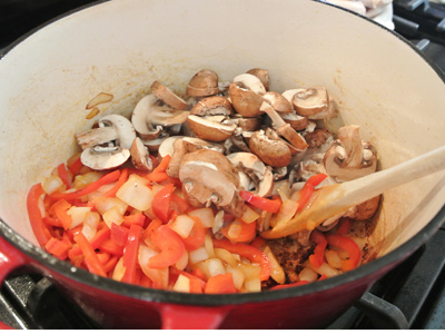 As the onions and peppers begin to sweat it out and become translucent, add in the mushrooms and stir the pot. Let the mushrooms cook down 2 – 3 minutes.