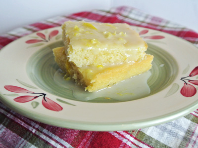 To make glaze, whisk together the sifted powdered sugar with the juice of 2 lemons and zest of 1 lemon. The glaze will be thin but very tart. Pour over cooled lemon brownies.