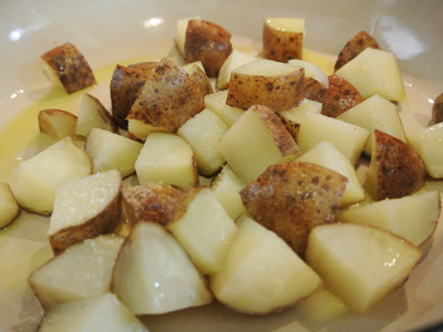 Taking a bite of potato with a little crispy texture is much more fun to eat than a boiled potato so I took an extra step to prep the potatoes. First cut the potatoes into cubes and set in a microwave safe bowl. Drizzle olive oil over the potatoes, cover and microwave on high 4 – 6 minutes. After 2 minutes, toss the potatoes and cook an additional 2 minutes. Test the potatoes with a fork after 4 minutes to see if they are soft. If they are still hard, cook an additional 1 – 2 minutes.