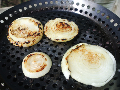 Flip the onions over often. A little char is good but they can burn fast so keep an eye on them. These have a bit of char and are now softened. Time for the next veggie!