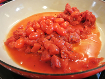 I set the pasta to boil and while that’s going I’m going to work on the sauce. I poured the can of tomatoes and grape tomatoes in my large skillet. I turned the heat to medium and set the lid on so the grape tomatoes would cook down just enough to burst with flavor. About 10 minutes will do it.