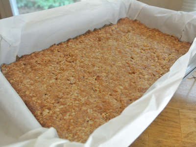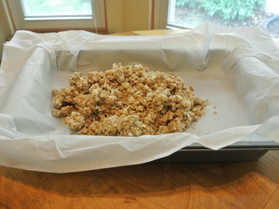 Line a 9 X 11 inch cake pan with parchment paper. Spread the remaining granola onto the pan.