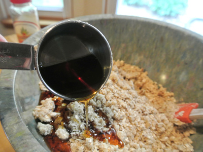 Pour your crumbly mix into a large bowl and add 1/3 cup of agave nectar. Stir with a spatula or wooden spoon until it all comes together.