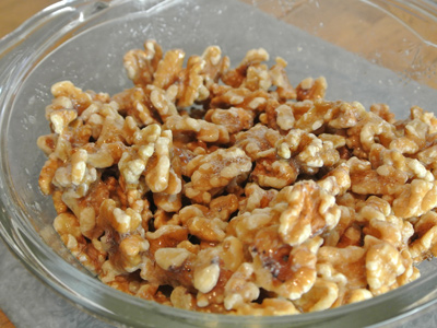 Line a large baking pan with aluminum foil. Spray with cooking spray and spread the walnuts onto the foil. Spoon any leftover vanilla sugar glaze over the walnuts.