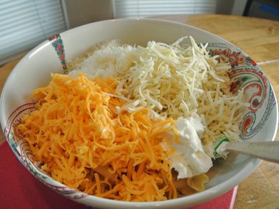 You’ll want the pasta to be very al dente so that it will not overcook and become rubbery when baked. I boiled it about 1/2 the time recommended on the box. Drain pasta and place in a large bowl.
