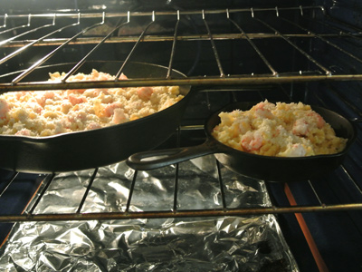 This will fit into a large 12″ cast iron skillet or baking dish. I filled a miniature cast iron skillet to make an individual serving here.