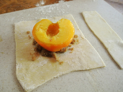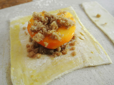 Sprinkle a little more of the brown sugar mix on top of the peach and brush a little egg wash around the outer edges of the pastry dough.