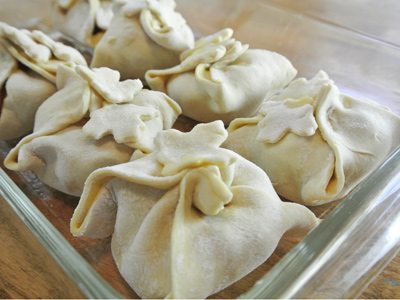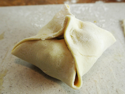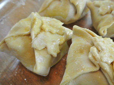 The egg wash works like glue to piece your dumpling together. Just pinch opposite corners to each other.