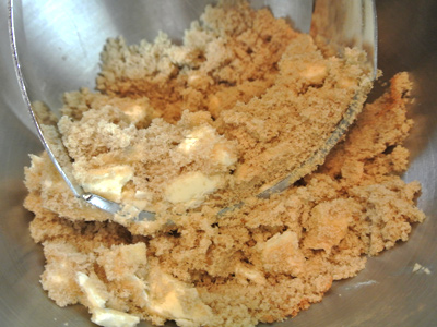 Cut in the butter with a pastry cutter until it becomes crumbly.