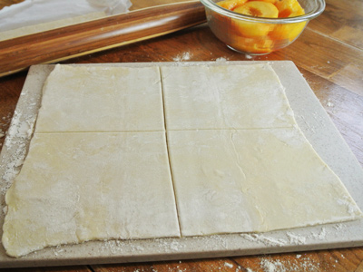 There are 2 sheets in the package. Flour a large surface and roll out the puff pastry just enough so that you can divide each sheet into 4 equal squares.