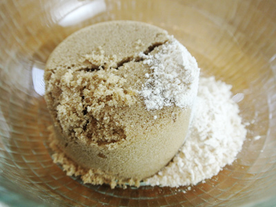 While the dumplings are in the oven, time to make the vanilla cream sauce. If you use white sugar you will get a lovely white cream sauce but I chose to use brown sugar because I love the taste of brown sugar on peaches. Combine the brown sugar and flour. Mix until well combined.