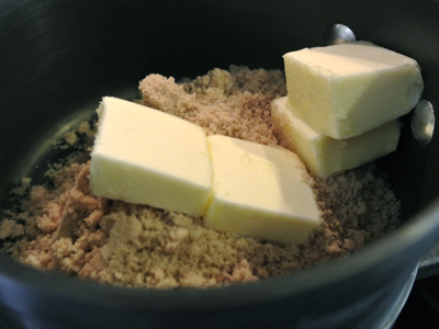 In a medium saucepan, add the brown sugar mix along with the butter. Stir over medium heat to melt the butter.
