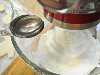 Continue mixing for 7 – 10 minutes. For the first stage you want the icing to be thick enough to pipe the outline of your cookies. Some of the icing will be thinned later to flood the cookies. If the icing is too thick to pipe easily, add a little bit of water, 1 teaspoon at a time until you have the right consistency.