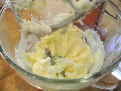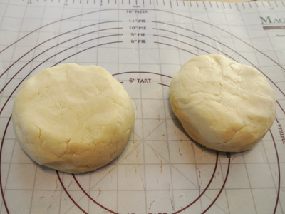 In another bowl mix together the flour and baking powder. Begin to add the dry ingredients into the creamed mixture a little at a time, beating after each addition. The dough should be very stiff and be easy to turn out onto a work surface. Knead the dough and divide in two. Knead each half into a round disc.