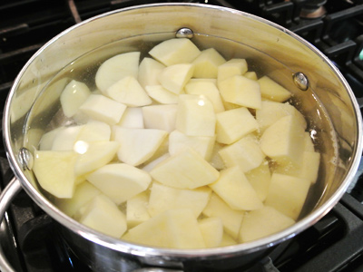 Peel and dice 2 pounds of russet potatoes. Place potatoes into a heavy bottomed 3 quart stock pot and cover with water. Heat on high until potatoes come to a boil. Continue to boil 25 – 30 minutes or until potatoes are soft and easily break apart with a fork. Drain potatoes.