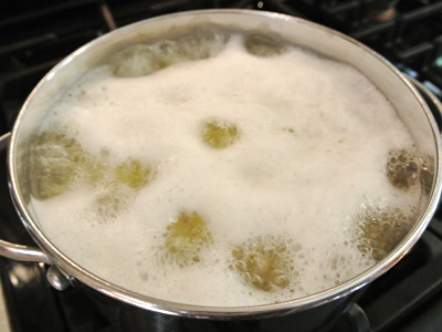Bring to a boil over high heat. Continue boiling 25 – 30 minutes. Check the potatoes with a fork for doneness. They should be soft and easily break apart when done.