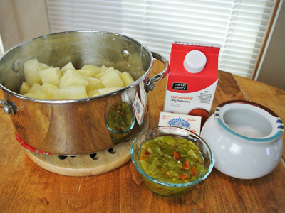Drain the water from the potatoes. A little side note . . . these were frozen chiles I found at Sprouts which contained a lot of liquid that went into the potatoes. Canned chiles will also have the same effect as these frozen ones. If using fresh chile that you roast and put up yourself, you may need additional liquid (half and half) added to the potatoes or they may be too stiff. Looks like I forgot the cheese in this pic!