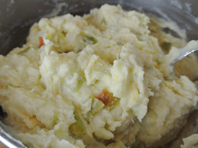 The cheese melts in so good you can hardly even notice it, but the taste is definitely in there. Fold in the chiles, taste and check the texture. If the potatoes are too thick, add some more half and half. If they are too thin, add a little more cheese. Salt to taste.