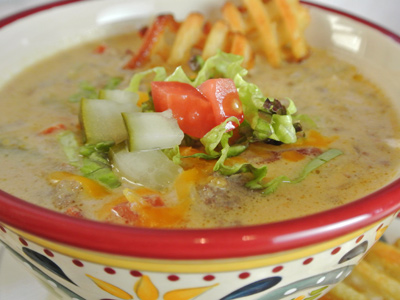 Another discovery from “Great Day Cafe” is their Cheeseburger Soup. Their daily soup menu changes day to day but you can always be sure to find a tasty bowl listed on the blackboard. My version has a few differences, however. Great Day Cafe cooked diced potatoes in their soup where as I like crisp fries on the side. Waffle fries are perfect to dunk in this soup and also as a side cruncher. To give it some New Mexican flavor add some green chile, which is purely up to you. Don’t tell Great Day Cafe, but I think I like my Cheeseburger Soup slightly better than theirs. That won’t stop me from going back, I feel inspired every time I visit their cafe!
