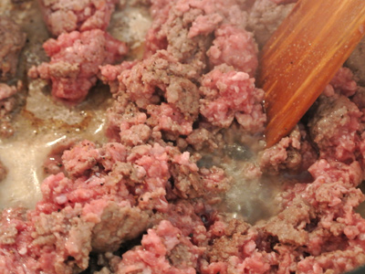 Season the ground beef with salt and pepper. When the ground beef has browned, remove with a slotted spoon to a plate lined with a paper towel and set aside.