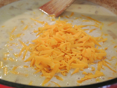 Next comes 1 1/4 cups of milk, 1 1/2 cups half and half, and 4 cups of cheddar cheese. Fold the cheese in slowly as it melts into the soup.