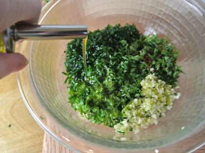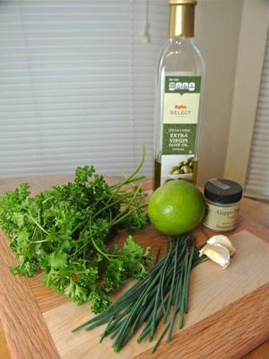 I made a chimichurri with fresh parsley, chives, garlic, lime zest, Aleppo pepper and olive oil.