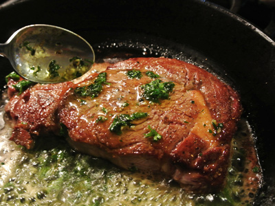 Turn off the burner and just spoon the butter and chimichurri over the steak and let the flavors flow over it.