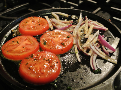 I drizzled the leftover butter and herbs onto a griddle and sauteed some onion and tomato slices for a couple minutes. I also popped in some sourdough bread in the toaster.
