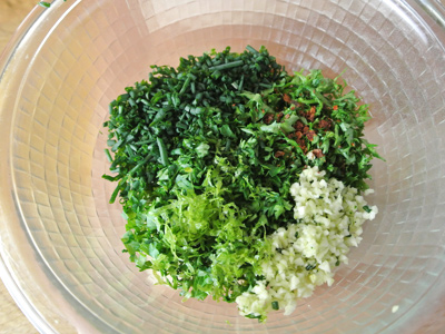 Roughly chop parsley and chives. Mince Garlic, zest lime and add a few shakes of Aleppo pepper.