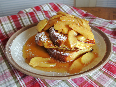 Top french toast with cooked apples.  Sprinkle with cinnamon, powdered sugar or add maple syrup if desired.