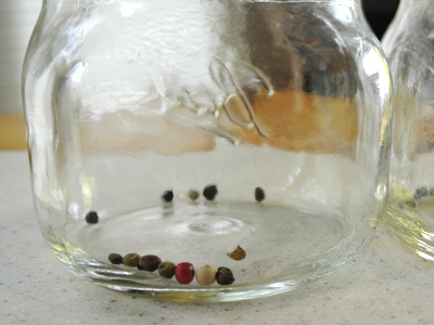 I boiled and sterilized 2 pint jars with lids. Sprinkle a few peppercorns in the bottom of each jar.