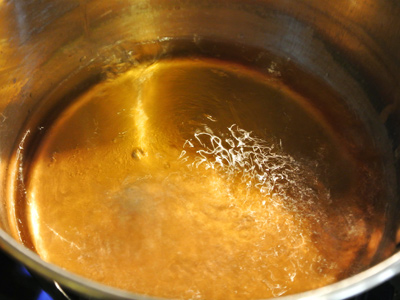 In a medium saucepan over medium high heat pour in the vinegar, 1 tablespoon of olive oil and 1 tablespoon of kosher salt.