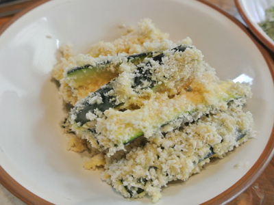 Roll the battered zucchini into the panko bread crumbs. Set aside in a bowl while you prepare the rest of the zucchini and chile strips.