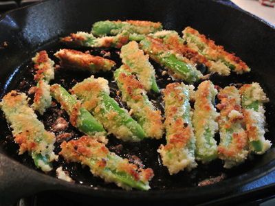 Then turn them over to brown another 2 – 3 minutes. Set them aside on a warming plate. Use a slotted spoon to remove any remaining crumbs in the pan, then coat the pan with another layer of olive oil. Once heated, add the next batch of zucchini or chile strips to cook. Continue browning in batches until all strips have been fried.