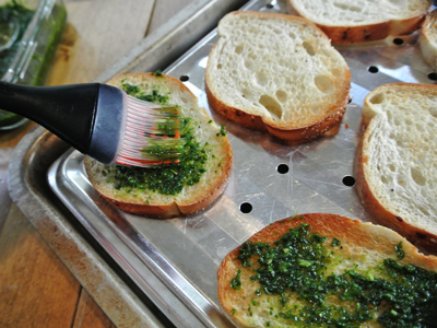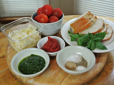 Toast the bread until it is lightly crisp and browned. Brush toast with some arugula pesto and add a tablespoon or two of roasted tomatoes. Sprinkle with bacon bits and bruschetta sugar. Pop back in the toaster oven on the bake mode at 400 degrees for 2 – 4 minutes. Just long enough to brown the edges of the toast, reheat the tomatoes and melt the sugar blend. Remove from oven and top with shaved parmesan and basil.