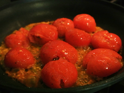 As the tomatoes begin to heat up they will start to soften and even appear charred. Toss them often so that they roast on all sides.