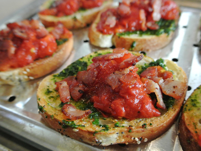 Sweet Roasted Tomato Bruschetta with Bacon Bits