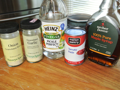 The homemade ketchup ingredients are tomato paste, distilled white vinegar, water, onion powder, garlic powder and maple syrup.