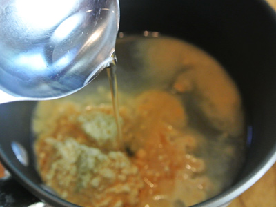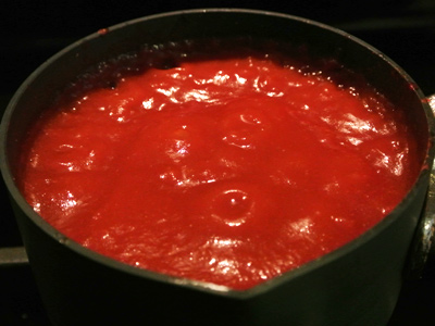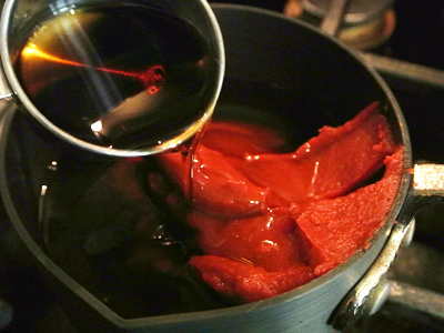 Begin combining the ingredients into a small saucepan over medium high heat. Start with the tomato paste and distilled white vinegar.
