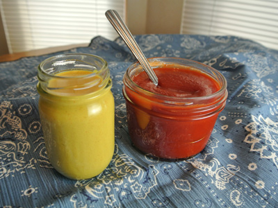 Have you ever wanted to make your own mustard and ketchup? I know that I have, but never knew how easy it could be. In less than 30 minutes I found I could make both and in my opinion tastes better than anything you can buy in the store. Josh came over one day and we set out to try different versions to see what tasted best. For the ketchup we tried a quick version which was made with a tomato paste base. It had just the right texture, was slightly sweet and had a very good taste. The other version was slow cooked with crushed tomatoes which we both decided tasted more like tomato soup than ketchup. Needless to say it’s not something worth posting. On the mustard side we tried mustard powder and mustard seeds. The mustard powder dissolved in minutes with water and vinegar with spices and thickened with some homemade Wondra flour. It’s spicier than your bottle of French’s you have in the pantry, so you may want to spread it lightly. But it has a wonderful flavor that makes every sandwich, burger or brat taste so good. The mustard seeds needed to soak overnight, then ground and strained but I could never get the same flavors to come out as I did with the powder. Maybe I need to give it another try but for now mustard powder is the tried and true. You can be sure that in a pinch you can have homemade mustard and ketchup in a matter of minutes with just a few simple ingredients.