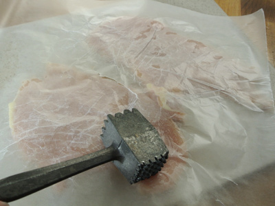 Place some wax paper over the top and pound the chicken cutlets to about 1/4 inch thickness. Set aside.  **Now would be a good time to get a pot of potatoes boiling to make some mashed potatoes.  The mashed potatoes I make are simple but tasty.  I’ll include my recipe but any family mashed potato recipe will do.
