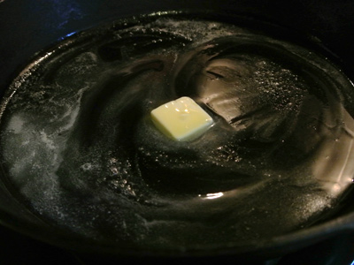 Add 1 tablespoon of vegetable oil and melt 1 tablespoon of butter in a 10 inch cast iron skillet over medium high heat.