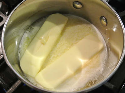 Begin by making the brown butter. Melt 2 sticks of unsalted butter in a medium saucepan over medium high heat.