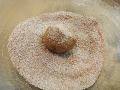 In a small bowl, combine the cinnamon and sugar. Roll the dough balls into the cinnamon sugar mixture and set on a baking sheet with or without the lining of a silpat baking mat. Set the cookies approximately 2 inches apart.