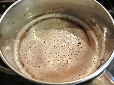 As it cooks it will begin to turn a deep amber color with browned solid bits of milk appearing like browned flakes that sink to the bottom of the pan.