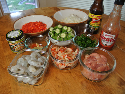 This recipe has a lot of ingredients, but don’t let that stop you. It’s really easy once the prep work is done. You’ll need 2 pounds of any combination of chicken, seafood or sausage, chopped onion and red bell pepper, some okra and fresh parsley. You’ll also need chicken broth, worcestershire sauce, red pepper sauce and a spice blend that I’ll break down later.