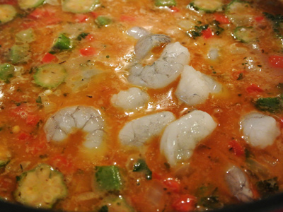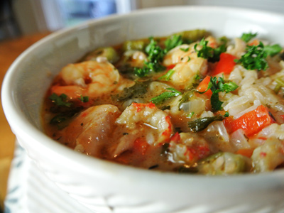 Recently I cleaned out my freezer and found a little bit of this and a little bit of that. I had a small amount of shrimp, lagostino tails and an odd package of chicken thighs. So I decided to put it all together in a spicy gumbo which is one of my favorite one pot wonders. It makes a complete meal ladled over sticky rice with a crusty slice of french bread on the side. Traditional gumbo includes a holy trinity consisting of chopped onion, celery and green pepper, however I make mine with a duo of onion and red bell pepper. I’m just not into celery and green bells. However if you like them, throw them in too and just cut back on the onion and red bell. It’s hard to find the Southern tastes of New Orleans here in KC but having a bowl of gumbo takes me there!