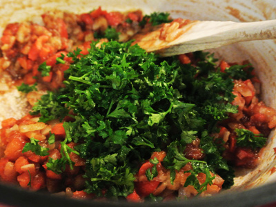 Add the chopped onion and red bell pepper to the roux. Stir the pot and let the veggies sweat it out for 7 -10 minutes. When the vegetables are soft and translucent, add the garlic and stir for 1 minute more. Next add the fresh parsley and pour in the chicken broth. Turn up the heat and add the remaining spices, worcestershire sauce, red pepper sauce, okra and meat combination. Bring just to a boil, then turn down the heat to simmer. Place the lid on top and simmer for 10 – 15 minutes.
