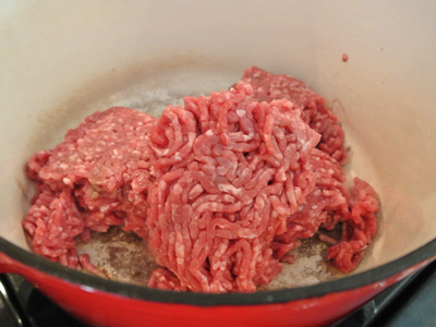 Time to put together the rest of the chile.  Brown 1 1/2 pounds of ground beef in a dutch oven.