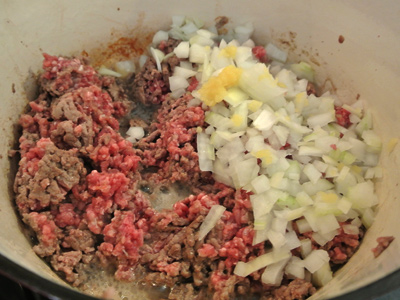 As the beef begins to brown, add the diced onion and garlic to the mix.  Stir the pot while everything cooks together.